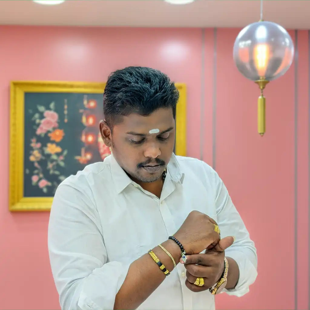 Karungali Hanging Bracelet is a traditional handcrafted accessory made from sacred Karungali wood, featuring a hanging design that symbolizes protection, positivity, and continuous spiritual energy.